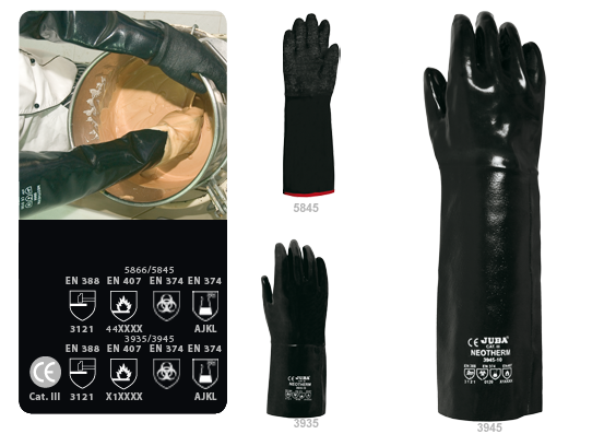 Manipulación en productos químicos fríos o calientes · Salpicaduras de aceites o líquidos calientes HASTA 180° C ESPECIAL PARA ALIMENTOS CUMPLE NORMA EN 388-EN 407-EN 374 MARCA JUBA Fabricación Española.