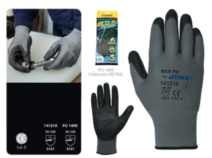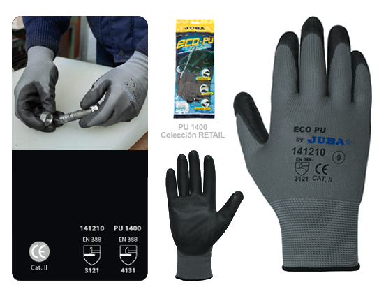 GUANTE POLIURETANO + POLIAMIDA ECO-PU Industria de todo tipo. Manipulación de montaje, piezas pequeñas.Embalaje.Construcción. Aplicaciones en entornos secos. RASGOS Manipulaciones confortables y precisas. Sujeción firme con resistencia a la abrasión.Destreza y sensibilidad.Color oscuro para entornos sucios.Versión económica industrial. CUMPLE NORMA EN 388 MARCA JUBA Fabricación Española
